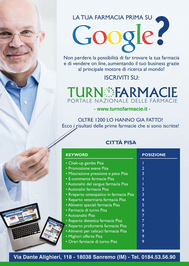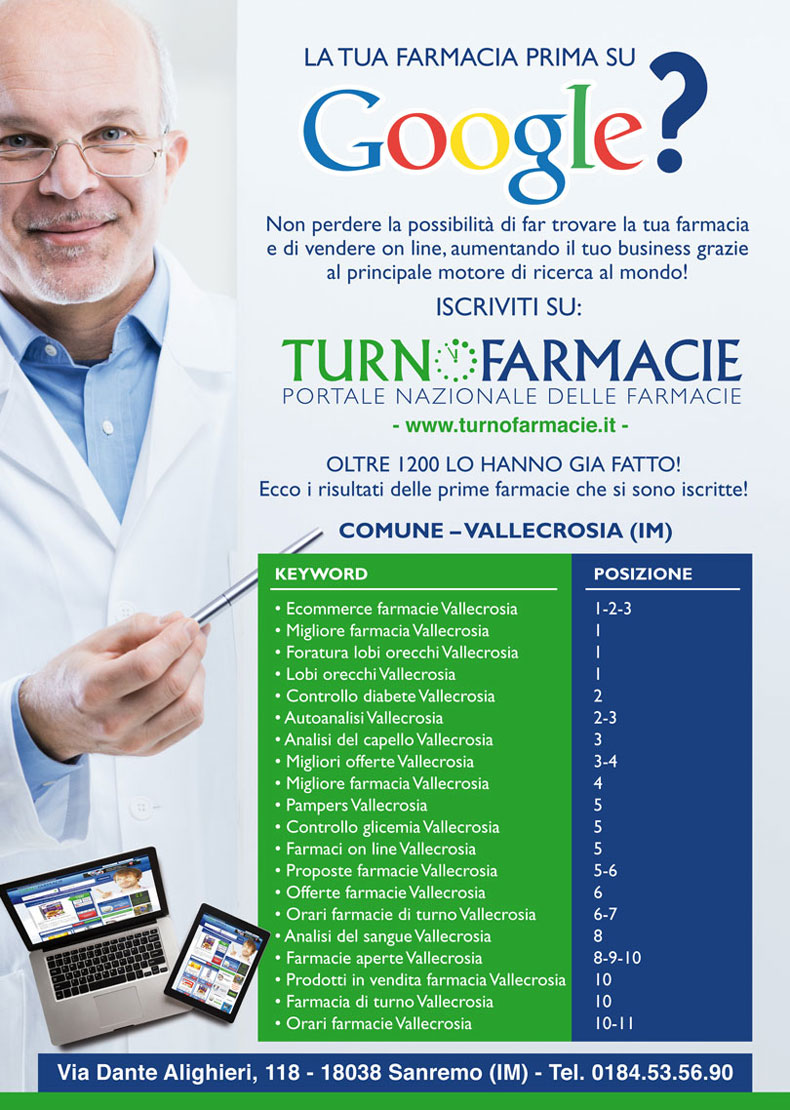Turnofarmacie.it, nasce dall’esigenza di avere un riferimento unico ed affidabile riguardo i turni delle farmacie. Siamo convinti che grazie alle moderne tecnologie il consumatore possa finalmente trovare sul web le risposte alle sue domande. • Qual è la farmacia di turno più vicina? • È possibile consultare quali sono gli ultimi prodotti medicinali o acquistare cosmetici da una farmacia online? • Quali sono le migliori offerte in farmacia? Grazie a turnofarmacie.it basterà un click per conoscere i turni farmacie in tutta Italia, ma anche acquistare cosmetici, integratori alimentari, prodotti omeopatici e tanto altro, selezionati tra le migliori offerte dei farmacisti in tutta Italia. Un servizio che permetterà di risparmiare tempo nella ricerca della farmacia di turno, ma anche denaro, grazie al confronto delle offerte delle farmacie. Turnofarmacie: il sito e-commerce della tua farmacia!